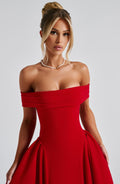 The elegant Miranda midi is made for those chic evenings, date nights and beyond. Cut from luxe stretch crepe, this style cinches at the waist with a sleek pleated bardot neckline. The look is complete with voluminous panels to each side, and tulle in the skirt for a full look. Partner with soft glam and waves.