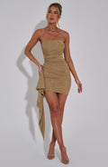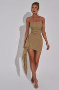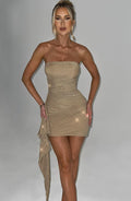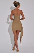 Prête pour un peu d'éclat pour la nouvelle saison ? Hannah sera votre alliée pour les cocktails sur les toits avec les filles qui se transforment en soirées tardives. Fabriquée à partir de notre maille scintillante très spéciale qui a des propriétés de maintien étonnantes pour sculpter la silhouette, cette mini-robe a un décolleté sans bretelles, des détails volantés sur la hanche et un ourlet asymétrique. Parfaitement associée à des sandales subtilement scintillantes et à un mini sac.