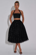 Oh, she's sparkly! You won't find any better than our signature sparkle mesh, a super soft fabric that feels as good as it looks. The Alani skirt is complemented with a full, gathered skirt made with tulle for that extra voluminous look. Make it a dreamy style match with the Alani midi and crop top.