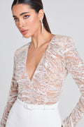 Bridal season is here with ALEXA White. A mesmerising jumpsuit made with embellished beaded sequins complete with a luxurious crepe flared trouser with a figure-flattering fit. This style looks equally as good with or without the detachable crepe belt.