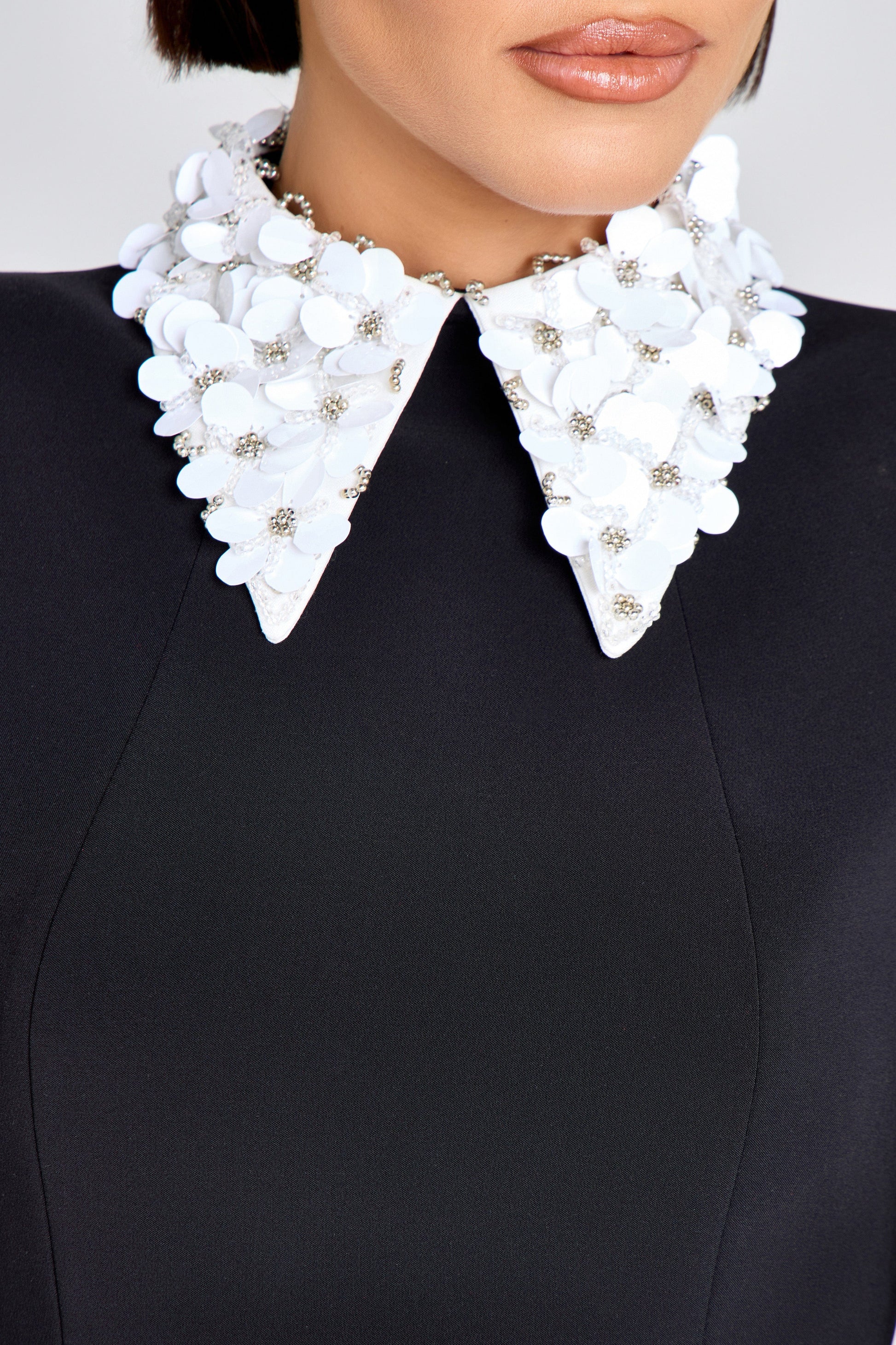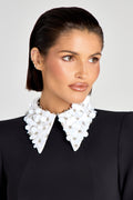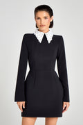 Delve into definition with the ALISHA Black Dress. Crafted from our signature crepe fabrication, ALISHA cuts a sculpted silhouette with sharp padded shoulders, a cinched waist, and a tulip mini skirt. A contrast appliqué floral collar brings bold detail to this little black dress, while slit detailing at the cuffs adds a modern edge. Finished with a concealed zip closure at the back for a smooth fit.