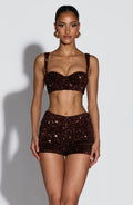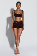 Amadi Shorts in plum brown showcase luxurious dense sequin velvet with an all-over shimmer. Cut as fitted, mid-rise hot pants, they deliver bold glamour for evening wear or statement styling. The rich plum brown tone adds depth and versatility to your occasion wardrobe.