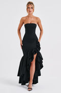 Enter your soft girl era in the Angelina maxi dress, crafted in our luxury non-stretch cotton blend fabric that hugs the body for the silhouette of dreams. This strapless design is complete with a voluminous frilled high low skirt that's super pretty and playful.