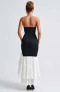 Enter your soft girl era in the Angelina maxi dress, crafted in our luxury non-stretch cotton blend fabric that hugs the body for the silhouette of dreams. This strapless design is complete with a voluminous frilled high low skirt that's super pretty and playful.