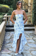 Enter your soft girl era in the Angelina maxi dress, crafted in our luxury non-stretch cotton blend fabric that hugs the body for the silhouette of dreams. This strapless design is complete with a voluminous frilled high low skirt that's super pretty and playful.