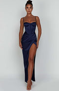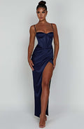 All attention, on you. The Despina maxi is a stunning choice for balls, formals, weddings and proms this season. Cut from luxury heavy satin with a stretch to skim over curves, this dreamy design is complete with a corset waist, thigh split, drape detail and underwired cups to lift and frame the bust. Style with glam waves and platforms.