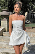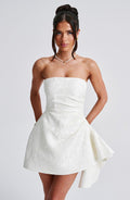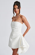 Cut from our luxe jacquard floral fabric with a pretty sheen, Elodie exudes Romance. This playsuit design has internal shorts with a skirt overlay, strapless neckline with asymmetric pleats to the bodice and a playful draped frill cascading from the hip. Dress yours up with sleek waves, a mini clutch and platform heels.