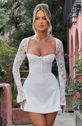Dreaming of dainty, delicate details? Meet Jacinta, your new fave mini made in luxury stretch floral lace with long, flared sleeves, a cupped bust and tie detail. This milkmaid inspired design will be your go-to throughout the season, whether it's styled with knee high boots for bottomless brunch or high platforms for your next date night.