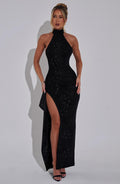 A showstopping piece for your wardrobe, Joelle is THAT girl. With a high, narrow neckline, low scoop back and draped detail thigh high split, the dress is cut from our super sparkly stretch mesh which snatches your figure. Partner with sleek black heels and a mini bag.