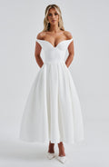 The epitome of elegance, Lanetta features a plunge bardot neckline with elasticated back strap bringing stylish flair. Falling to an effortlessly chic midi length, the design has a full, box pleated skirt and looks amazing paired with pointed heels and soft glam.