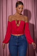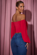 Off-Shoulder Draped Balloon-Sleeve Top in Red